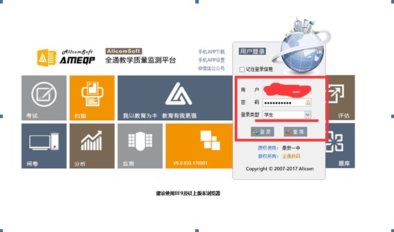 学成成绩查询说明 1、首先登录网址//112.245.48.30:8000/ameqp 2、用户名为手机号,初次登录密码也是手机号。(登录以后可以修改密码)登录类型为学生