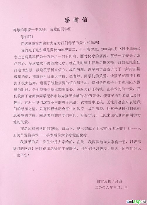 高二11班张安琪同学去年被检查出腿部患骨肉瘤急需救治,面对同学的重病与困难泰安一中的全体师生自发的伸出了援助之手,很短的时间内就捐款10余万元送到安琪的手中,使得安琪同学得到及时顺利治疗。谱写了一曲和谐互助的赞歌。