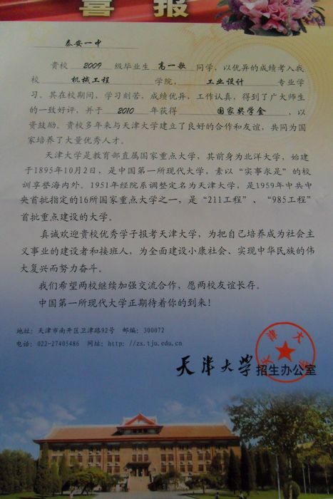 天津大学致我校喜报