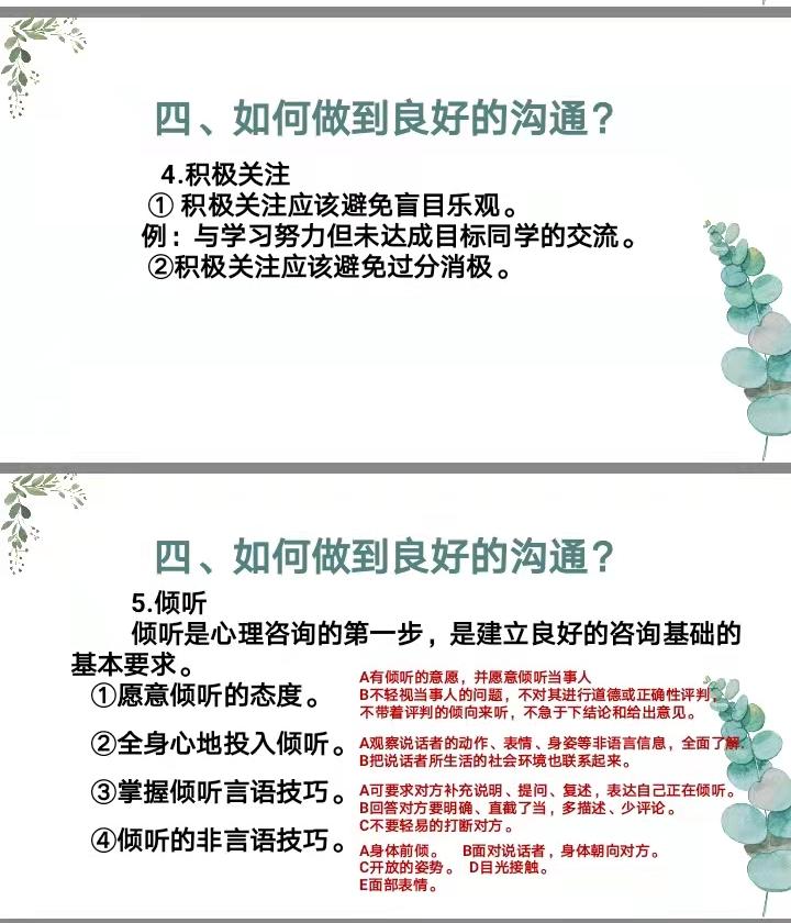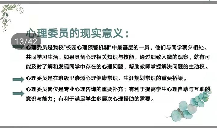 为完善我校心理健康危机预防与干预的长效机制,高效开展心理健康教育工作,营造“阳光心灵”校园氛围,2021年12月16日下午,泰安一中2021级全体心理委员在电教楼心理健康团体活动室进行了培训,心理咨询中心专职教师担任此次主讲。