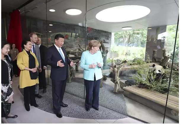7月5日,国家主席习近平同德国总理默克尔共同出席柏林动物园大熊猫馆开馆仪式。这是习近平和夫人彭丽媛同默克尔在大熊猫馆。 新华社记者马占成 摄 7月5日,正在德国进行国事访问的习近平主席,同德国总理默克尔共同出席柏林动物园大熊猫馆的开馆活动。此前,习主席在德国主流媒体发表的题为《为了一个更加美好的世界》的署名文章中表示,希望已经抵达柏林的这对大熊猫成为中德友谊的使者。 在柏林,因为中国大熊猫“梦梦”和“娇庆”的到来,整个城市都沸腾了。柏林市民把它们当作“中国的一个元素”,赞其“甜美、漂亮、友好”。“国宝”大熊猫萌态可掬、温和敦厚,在全世界吸粉无数,无疑是一张颇受追捧的中国名片。 世界收到的中国名片,不只大熊猫。习主席曾感慨:走了很多国家,谈的最多的合作项目之一就是高铁。 这些年,伴随习主席走向世界舞台的步伐,一张张“中国名片”亮相世界。有“萌萌哒”的大熊猫,也有“棒棒哒”的中国高铁、中国核电、中医药等,还有“美美哒”的古典名著、书法、景泰蓝等。每一张“名片”,都是一扇感受中国、读懂中国的文明之窗。 透过“中国名片”,人们看到了一个和平友善、开放包容的中国。 据史料记载,早在唐代,中国政府就曾将大熊猫赠予他国。新中国成立以来,大熊猫漂洋过海、远赴他乡,在对外交往中扮演“友谊大使”角色,成为“最萌外交官”。随着大熊猫一起走出国门的,还有中国人民的友善与温情,对和平的向往与追求。 “看到大熊猫,我的心都融化了”。大熊猫不管来到哪里,总能激起民众发自内心的爱意,总是带来温暖与欢乐。“国之交在于民相亲,民相亲在于心相通。”大熊猫如同一条心灵纽带,让世界感受到来自东方的善意,激荡起超越国界的情感共鸣。因为拥抱你,才会拥抱你的国。今天,许多国家的人民一讲到大熊猫,就会在脑海中浮现出中国的和平友好形象,这已经成为中国软实力的一个生动体现。 透过“中国名片”,人们感受到一个锐意创新、充满活力的文明现代国家。