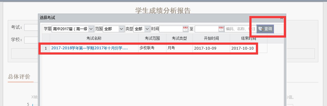 5、点击查询,选择蓝色字体的考试 6、选择学校、班级、学生,然后点击下方的对应科目即可查看对应的成绩。