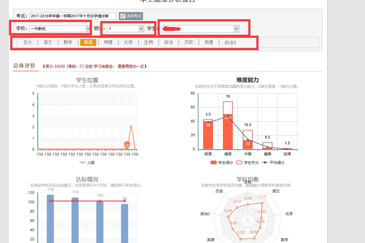 6、选择学校、班级、学生,然后点击下方的对应科目即可查看对应的成绩。