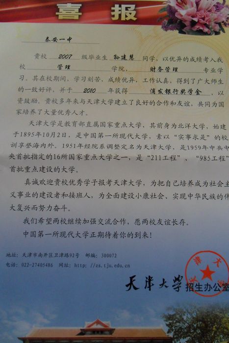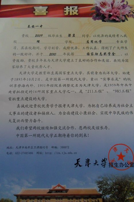 天津大学致我校喜报