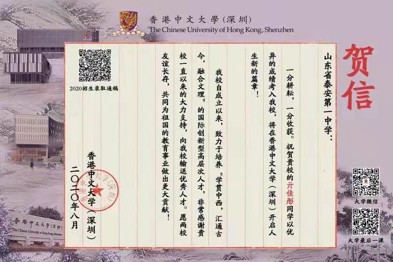 亓佳彤,2017级校友,2017年9月—2020年6月就读于泰安一中,2020年考入香港中文大学学习。 亓佳彤温文尔雅,文理兼优,是一个思想品质优秀、学科特长突出的学生。在校期间,她曾获得2018年全国中学生数理化学科能力全国二等奖,2019年华东师范大学“非常数学营”全国三等奖,第十七届全国创新英语大赛华北赛区一等奖,第二十届“语文报杯”全国中学生作文大赛省一等奖,第十六届“叶圣陶杯”全国中学生新作文大赛二等奖和山东省第三届中学生基础知识与创新能力大赛二等奖等多个奖项。爱好广泛的她还参加了学校的播音社团和话剧演出,她的素描作品多次荣获我校萃英艺术节师生书画展一等奖。虽然高中学业繁忙,节假日里,她还不忘到社区辅导学弟学妹功课,到福利院关爱自闭症儿童和罹患老人。2018年,她的文学著作《随光而栖》由团结出版社正式出版。2019年3月,她的文章《由新高考“六选三”引出的递归问题》发表在《数学学习与研究杂志》。 青灯黄卷写志向,追风赶月念理想的高中时光让亓佳彤念念不忘。她认为,对未来的真正慷慨,是把一切都献给现在。因此,她将自己的著作《随光而栖》捐赠给母校,表达她对培养自己的母校和老师们的感恩之情。在此,我们祝愿亓佳彤勤奋努力,百尺竿头更进一步!