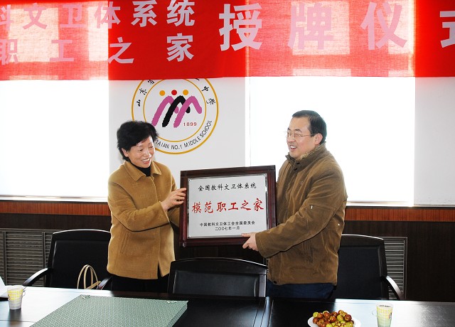 今天下午, 市教育工会王振凤主席、车西柱副主席到我校,代表全国总工会向泰安一中隆重授牌,授予我校全国教科文卫体系统模范职工之家荣誉称号,张勇华校长代表泰安一中接受了奖牌。