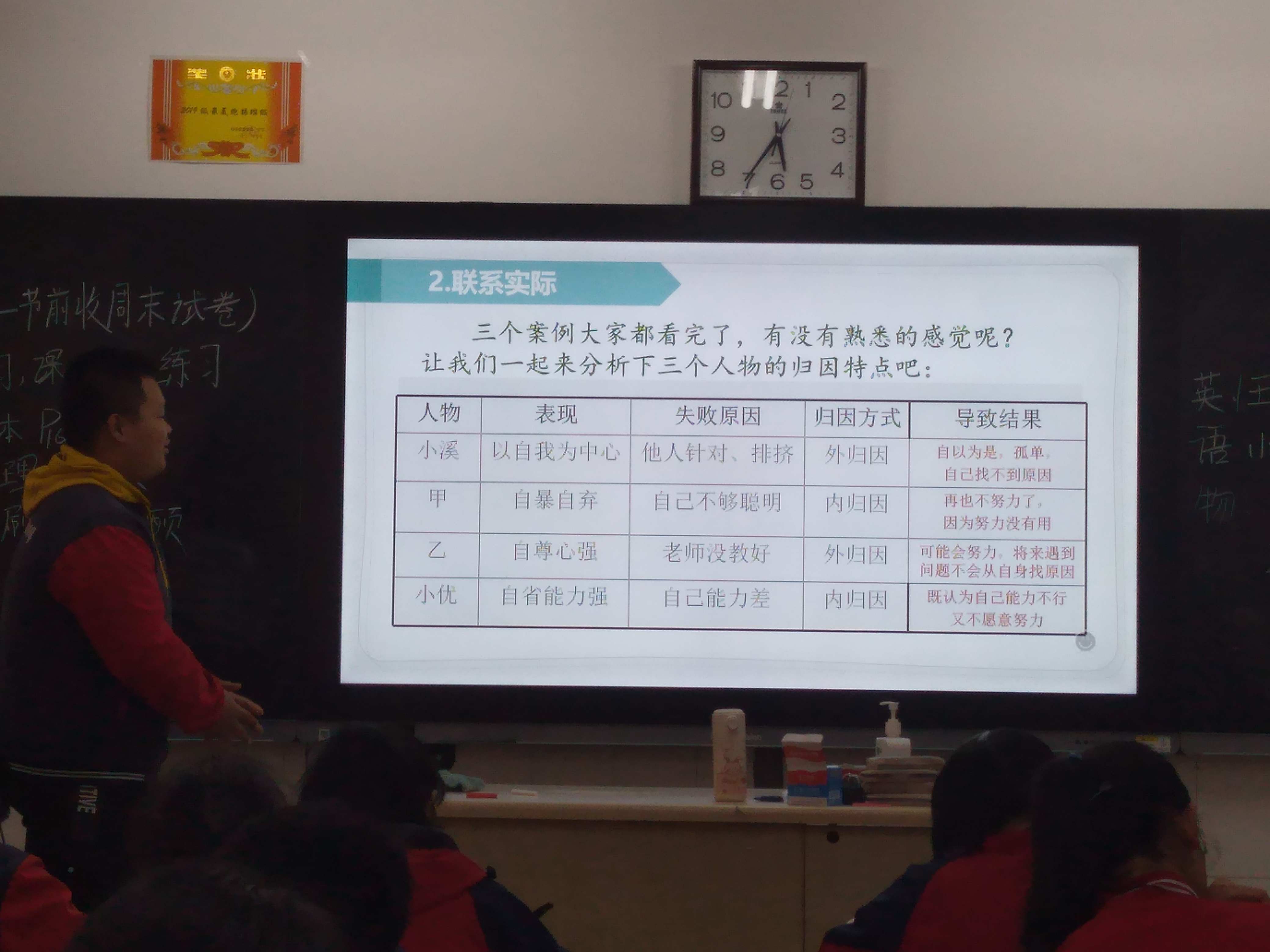 ![]() 一个人把自己的成功或失败归因于什么,这会影响到今后行为的发展。若把失败归因于能力不足,则当这个人在失败时一般不会再去争取胜利;若认为失败的原因是自己努力不够,则将倾向于通过更多努力以求成功。 现实中学生总是有意无意地在自己的学习、人际交往等出现问题时寻找原因,大部分学生习惯将责任推卸到别人身上,“只缘身在此山中”,看不到自己的缺点,这是一种严重的归因偏差行为。 学生对自己的归因方式不仅反映着他们寻找学习结果的倾向,而且还会影响到学生的学习动机,甚至影响到其人格特点。因此,2021年4月12日泰安一中青年路2019级部各班开展了一节别开生面的心理健康主题班会课——《合理归因益身心 阳光心态利成长》,帮助学生了解自己的归因类型,引导他们对自己学习成绩、人际交往等进行合理的归因,有效地激发了学生的学习积极性、学习动力,有助于培养学生良好的人格特征。 ![]() ![]() ![]() 暖身活动——“背靠背” ![]() 一个简单的背靠背游戏,同学们就能分析出许多的原因,找到了自己努力的方向。 ![]() 填写心理调查问卷来分析自己是外部归因还是内部归因。 ![]() 分析案例,联系自身实际,探讨如何进行合理归因。 ![]() 不同的归因特别反映一个人对事情的不同看法,它会影响到人们的行为方式。总是内部归因或外部归因都是不妥当的。前者让人消极被动,不愿通过个人的努力来改变;后者易让人自卑,失去信心,什么事都做不好。不合理的归因就像带了有偏差的眼镜,产生的结果是对人对事的看法与实际情况产生很大的偏离,最终导致我们采取错误的行为方式。 心理学家维纳认为我们一般把成败的原因归结为以下几个方面:能力、努力、任务难度、运气等。并且,他把人们归纳的这些原因进行了分类:从来自于内部和外部将它分为内因和外因;从它能不能被我们个人意愿所控制将它分为可控和不可控;根据稳定性分为稳定和不稳定。 ![]() 合理归因的目的是明确努力方向,去取得更大的进步和成功。每次归因之前应当有这样一个信念——命运只能掌握在自己的手中! 正确的归因是过去事情的完美结局,更是下一次成功的良好开端! |